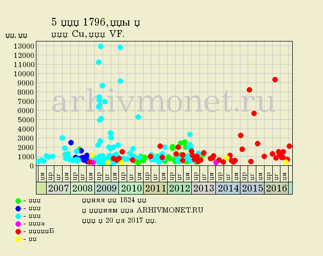 Средняя цена: 1824 рублей (по 292 лотам). Торги по представленной на фото монете состоялись на аукционе Аукцион.СПБ 22 марта 2017 года. Достигнутая цена на торгах: 2129 рублей.