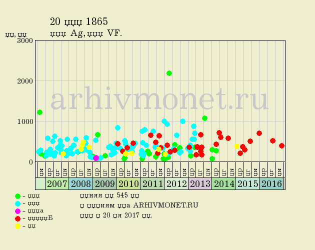 Средняя цена: 545 рублей (по 161 лоту). Торги по представленной на фото монете состоялись на аукционе Аукцион.СПБ 08 февраля 2017 года. Достигнутая цена на торгах: 400 рублей.