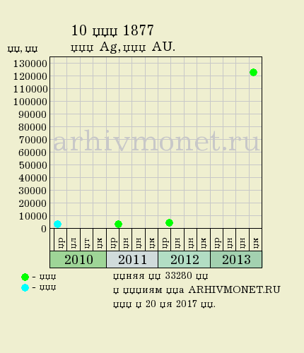 Средняя цена: 33280 рублей (по 4 лотам). Торги по представленной на фото монете состоялись на аукционе Волмар 05 декабря 2013 года. Достигнутая цена на торгах: 123000 рублей.